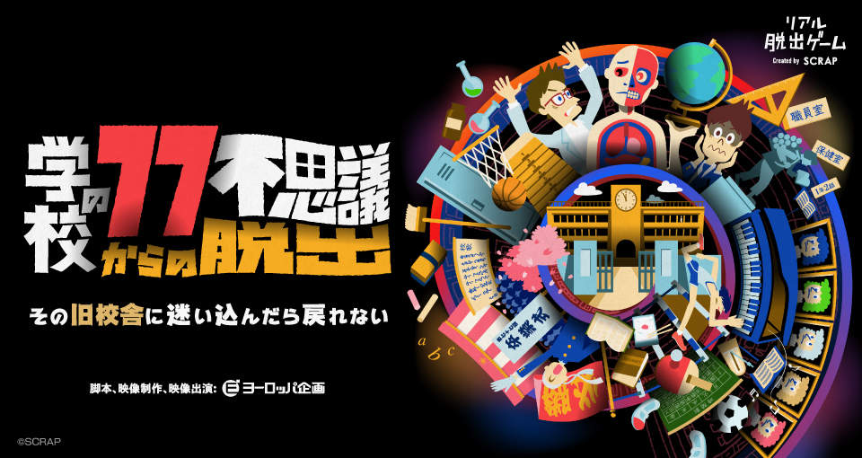 本作は、“企画性コメディ”を得意とする劇団「ヨーロッパ企画」とSCRAPがタッグを組んで手がけた『学校の77不思議からの脱出』は、学校に巻き起こる77の“怪異”をめぐる、発見とひらめきが止まらない新感覚のリアル脱出ゲームです。