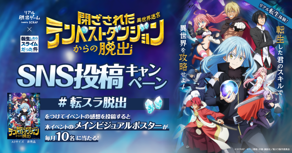 イベント開催を記念し、期間中『閉ざされたテンペストダンジョン(異世界迷宮)からの脱出』に参加した感想を「#転スラ脱出」をつけてXまたはInstagramに投稿すると、毎月10名にイベントのメインビジュアルポスターが当たるSNS投稿キャンペーンを開催いたします。ここでしか手に入らない当イベントの描き下ろしイラストのポスターが入手できる大チャンス。この機会にぜひご応募ください!